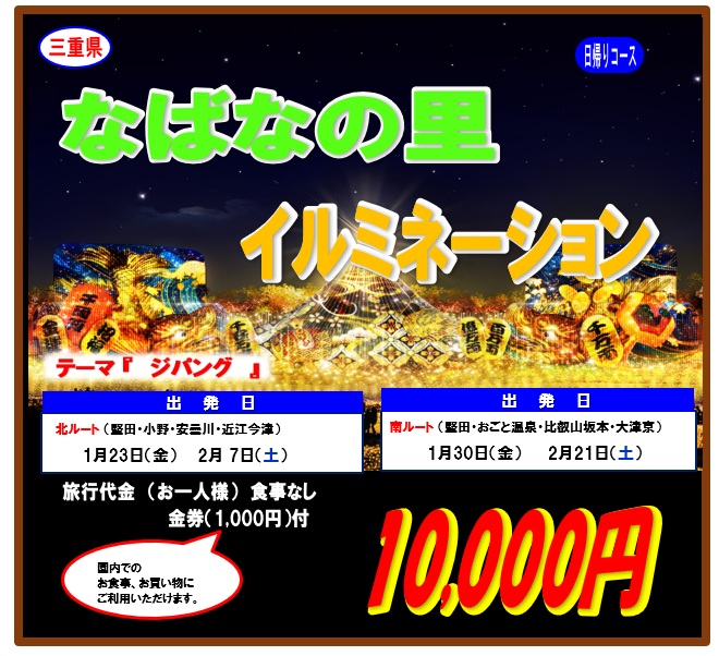 | お申し込み・お問合せ先 | 江若貸切バス旅行センター : 滋賀県知事登録旅行業第2-173号 電話 077-573-2708 (受付:平日8:30~17:30) |