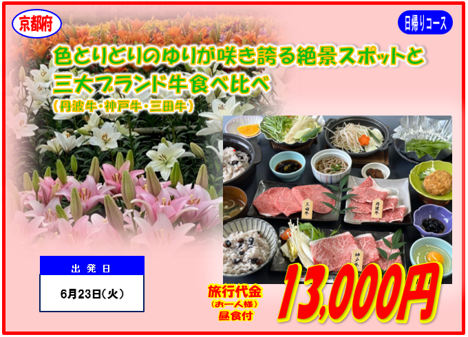 【色とりどりのゆりが咲き誇る絶景スポットと三代ブランド牛食べ比べ】